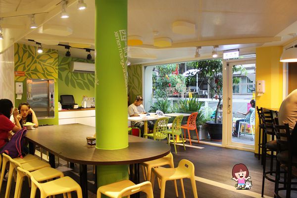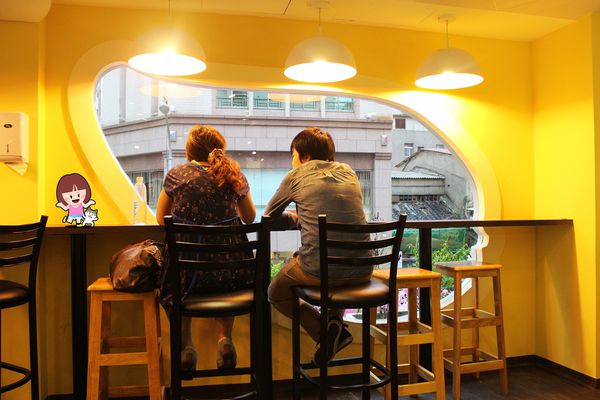 這是二樓另一角落,透明玻璃窗用成芒果圖案,好可愛,而且外面還有露天位置,搭配著假的芒果樹在外頭吃冰,也太好玩了,可是就是因為太熱才會來吃冰,所以我還是乖乖在裡面吹冷氣吃冰啦~突然想到一件事,西門町芒菓冰這店名在夏季盛產芒果冰還很適合,但到了冬天怎辦?